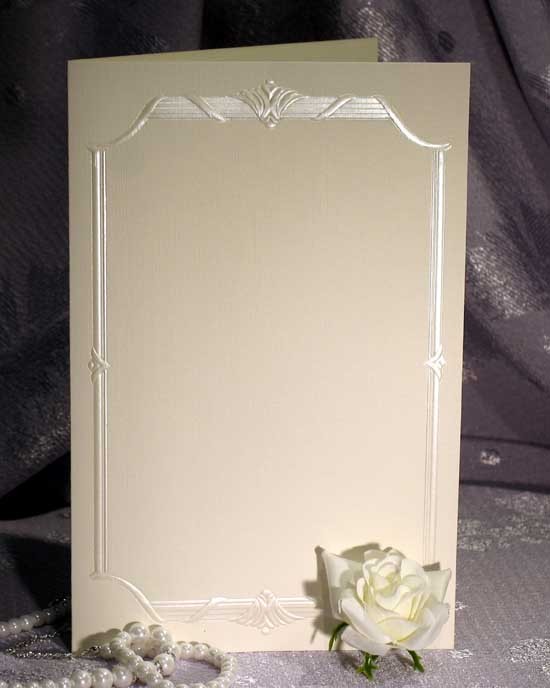 A classic and antique border, pearl stamped and embossed on invitation weight paper.