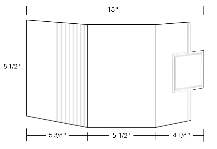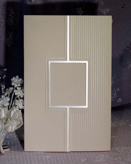 Exclusive pearlized & embossed outlined square in center with pearlized needle stripes on 2 1/2 fold fine silk invitation weight paper.